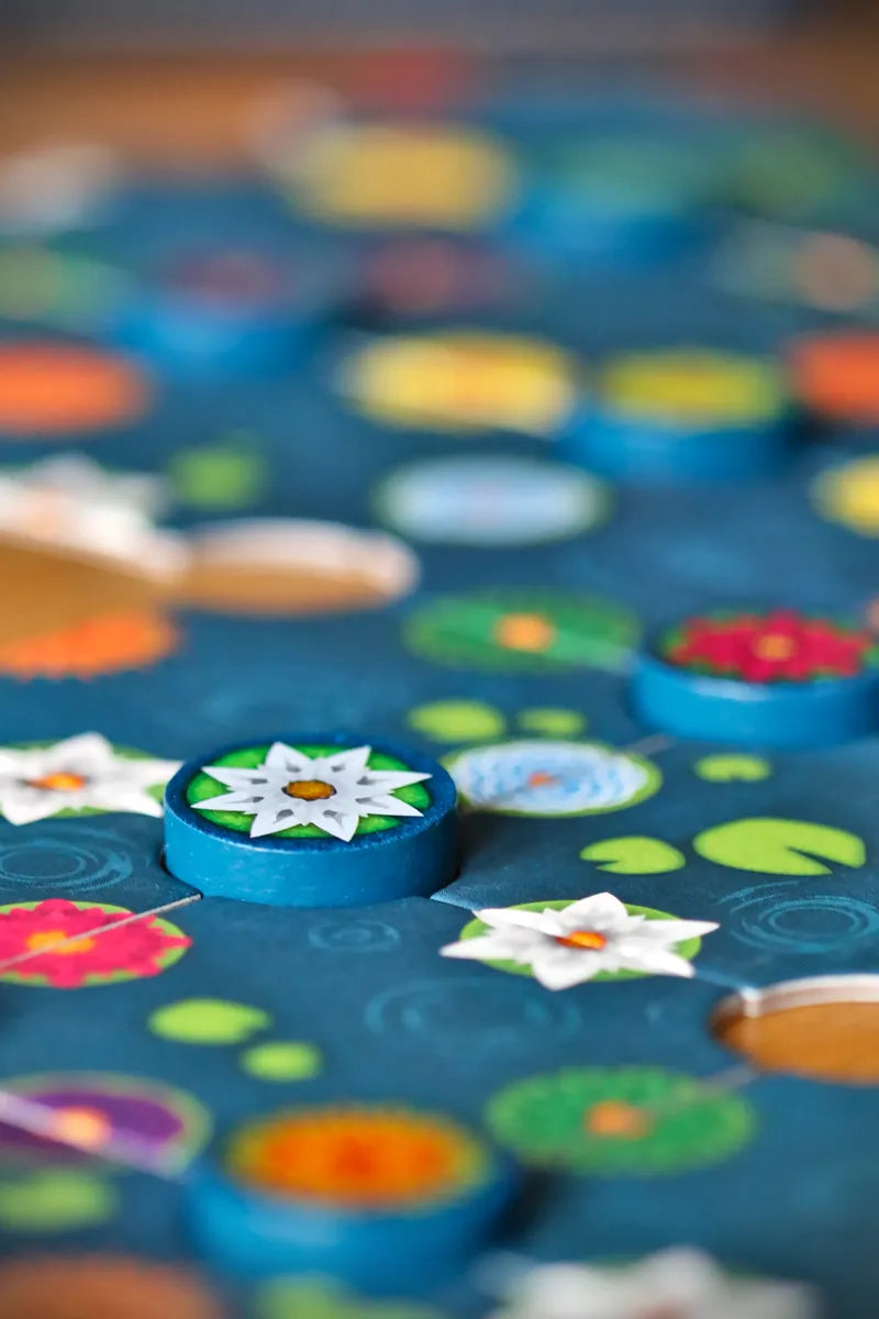 You have come to the lake hoping to see a rare and beautiful sight. The lilies of the lake only open their blossoms in the rain, and only rarely do all eight kinds of lily bloom at once. The goal of A Gentle Rain is to place the lake tiles in such a way to cause all eight types of lilies to bloom before you run out of tiles and the rain ends.