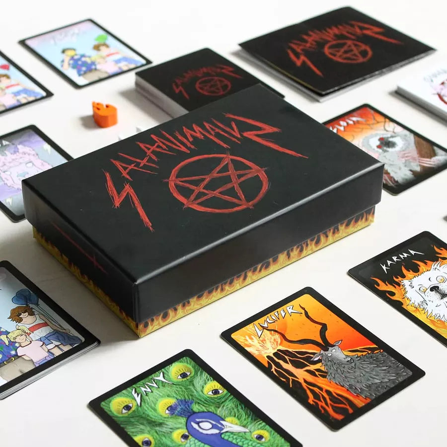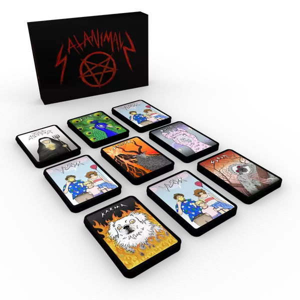 There are 5 different satanimals to collect for your petting zoo in order to attract visitors: Karma the Dog, Ouija the Alpaca, Lucifer the Goat, Envy the Peacock and of course, Sloth the Sloth! How will you build your zoo? Quickly, to catch your opponents off guard, or slowly, to amass a grand amount of points?