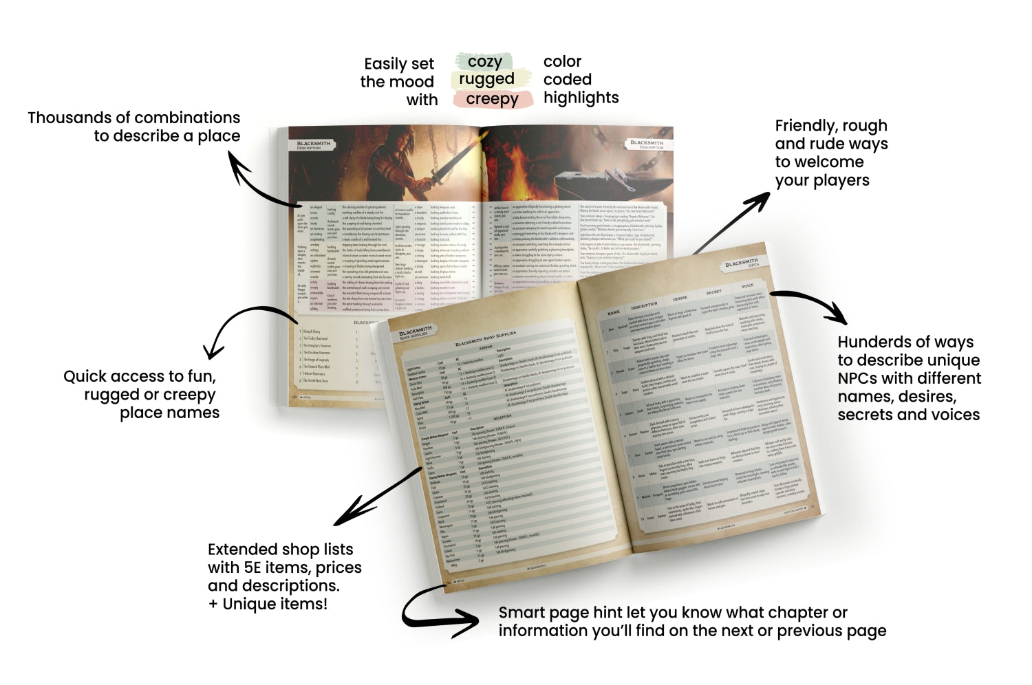Everything is written in a way that gives the DM endless cozy, rugged or creepy options to describe their world and the people in it.